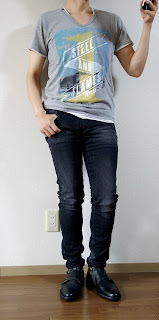 リプレイの濃いジーンズを手に入れたので、シンプルで簡単に着こなしてみたい。ボトムとトップの濃淡をハッキリしてあげるとデニムonデニムが楽に決まるので、初心者の方は試してみて欲しい。